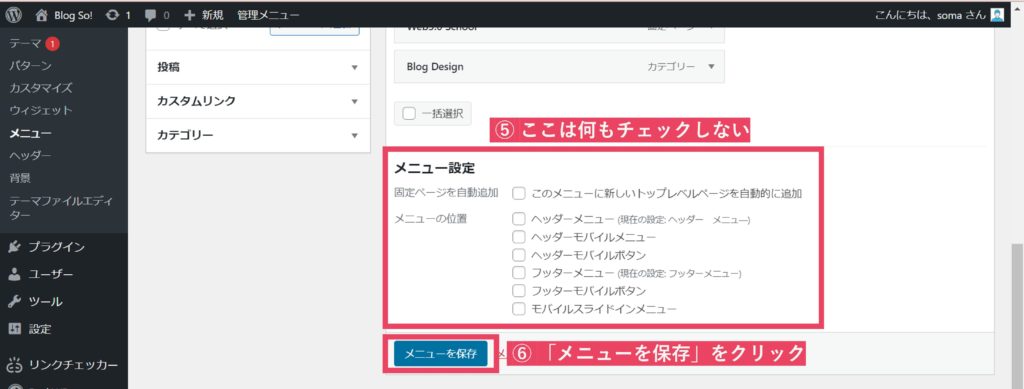 メニュー設定の項目には何もチェックを入れず、「メニューを保存」をクリックします。