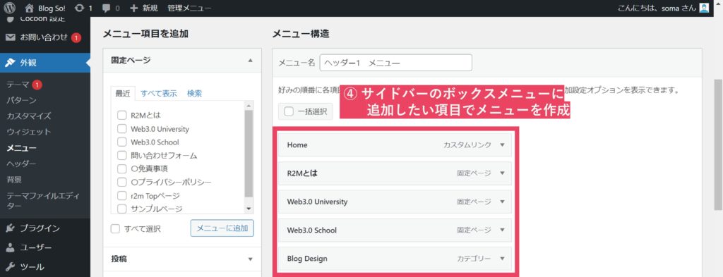 ボックスメニューの「メニュー名」で、先程作ったメニューを選択します。 僕の場合は「ヘッダー1 メニュー」です。