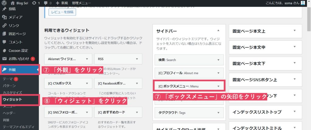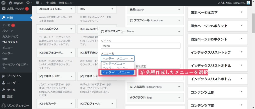 「外観」→「ウィジェット」→「ボックスメニュー」の矢印をクリックし、隠れている項目を表示させます。