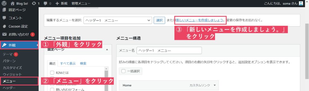 「外観」→「メニュー」→「新しいメニューを作成しましょう。」 と順番にクリックしていきます。