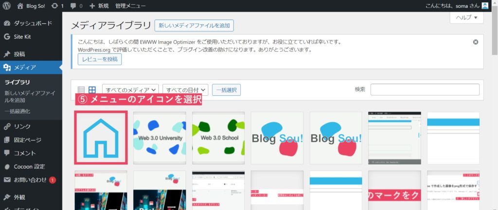 「メディアライブラリ」を開き、アイコンにしたい画像を選択する。