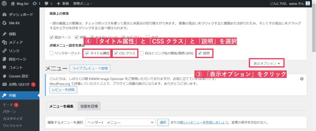 画面上部の「表示オプション」をクリックし、以下の画面を引き出す。その後、「タイトル属性」、「CSSクラス」および「説明」を選択する。