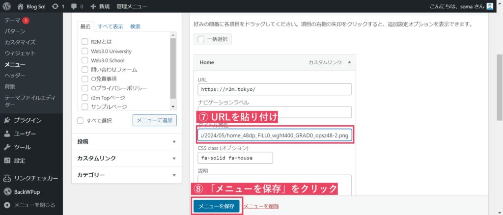 その中の「タイトル属性」に先程コピーしたURLを貼り付けます。最後に「メニューを保存」をクリックすれば変更完了です!