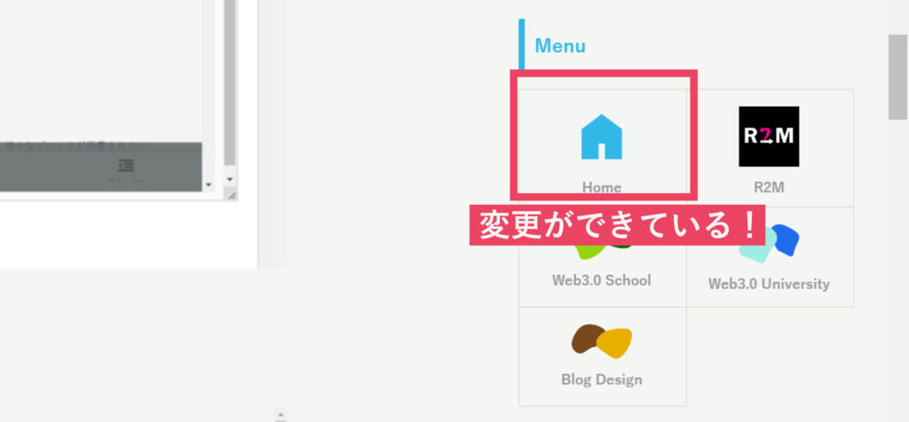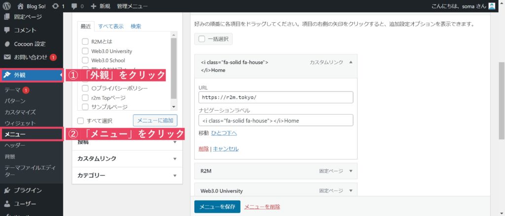 先程の画面を開く(「外観」→「メニュー」→「編集するメニュー」でボックスメニューにしているメニューを選択する。)