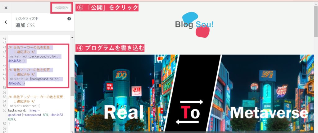 「投稿」→「投稿一覧」→「表示」というアイコン →「新しいタブでプレビュー」でマーカーの色を確認してみてください。意図通りに変更できたことが確認できていると思います。