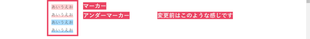 ちなみに、文字全部を覆うマーカーを「マーカー」といい、下半分を覆うマーカーを「アンダーラインマーカー」と言います。 今回は、両方とも変更していきます。