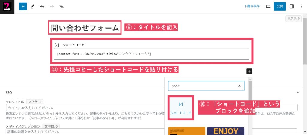 タイトルを記入し、「ショートコード」ブロック を追加します。ショートコードブロックの中に先程、コピーしたコードを貼り付けます。 これで設定完了です!