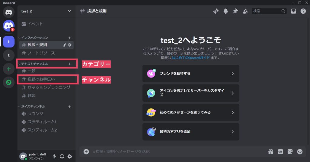 Discordには、サーバー、カテゴリ、チャンネル が存在します。