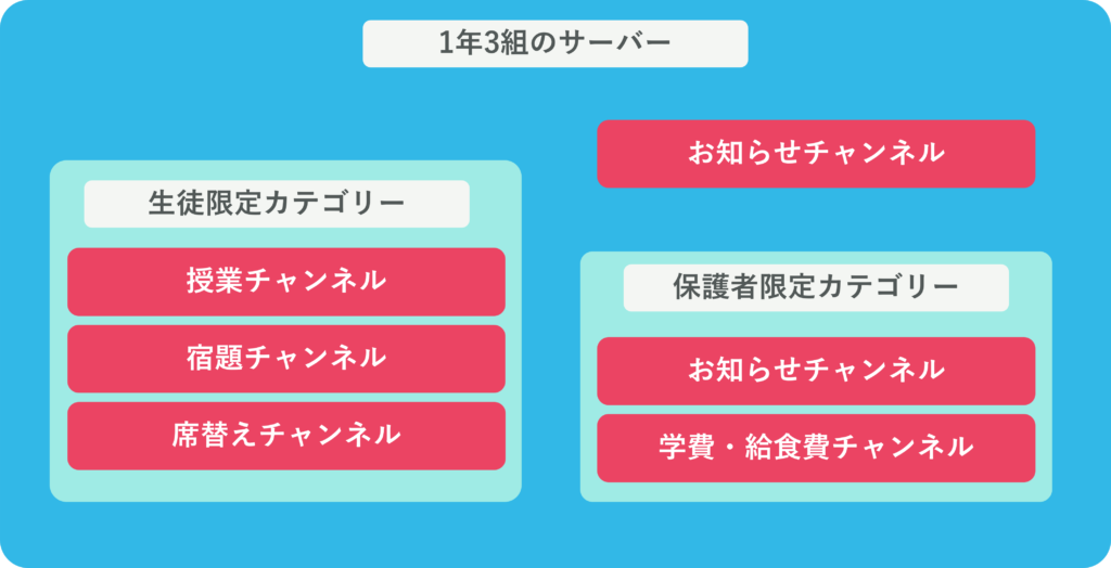 まず、1年3組サーバーには生徒と、その保護者が参加しています。このように、サーバーは関係者すべてが参加する一番大きなくくりです。