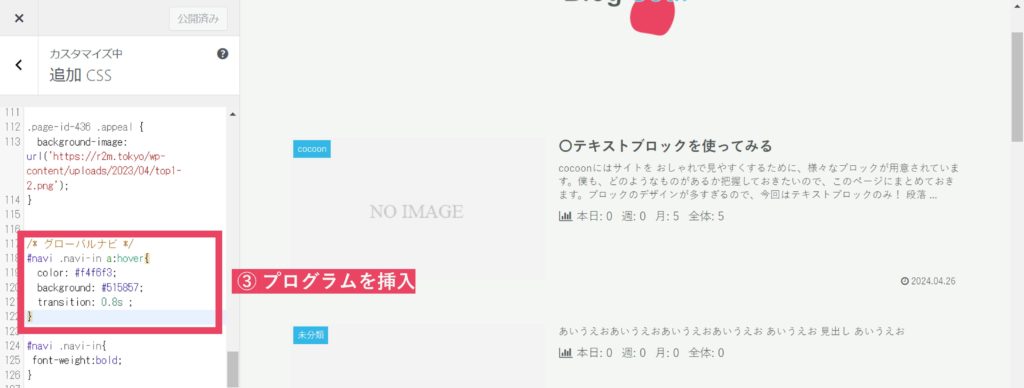 ここに以下のプログラムを追加します。 コピー&ペーストで構いません。このコードを追加し、「公開」をクリックすれば、変更完了です!