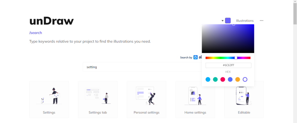 ちなみに、サイトの右上にある色のボタン(lllustrastionsの左にあるボタン)をクリックすると色を変えることができます。 写真の「#6C63FF」の部分を好きなカラーコードに書き換えてみてください。