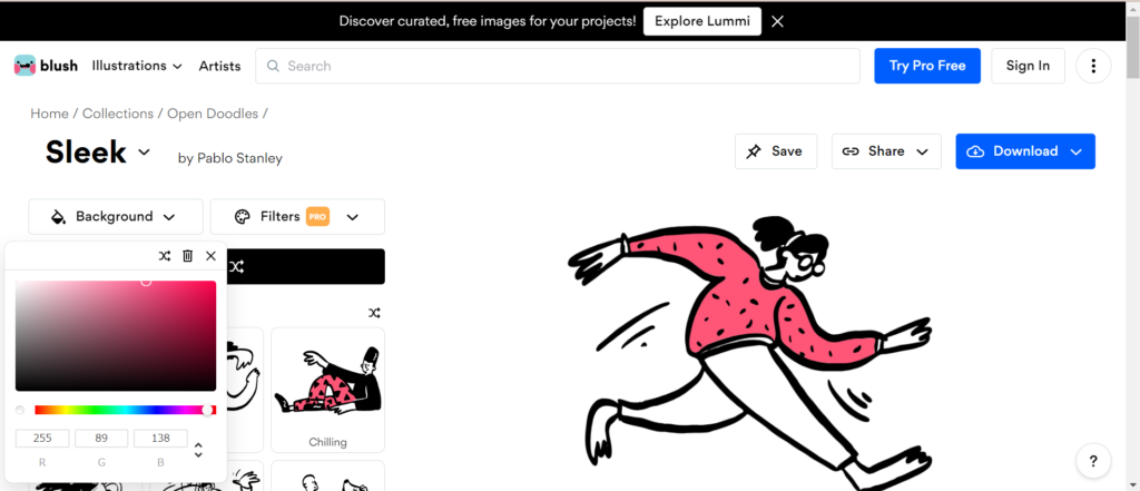このサイトのイラストも色を変えられるみたいです。「Background」は無料で色を変えることができました。「Background」とはおそらく、下の画像のピンク色の部分です。どうも、Open Doodles は、さらに自由度の高い色の変え方ができるみたいです。それは「Filters」というボタンからできます。しかし、これには Pro へのアップグレードが必要であり、お金がかかります。 ちなみに、画像の保存は右上の青い「Download」から…