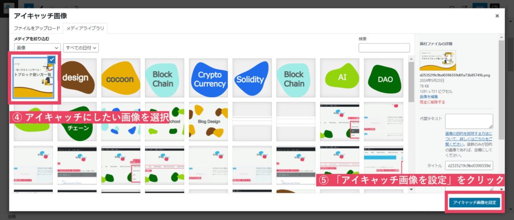④ アイキャッチにしたい画像を選択し、⑤ 「アイキャッチ画像を設定」をクリックします。
