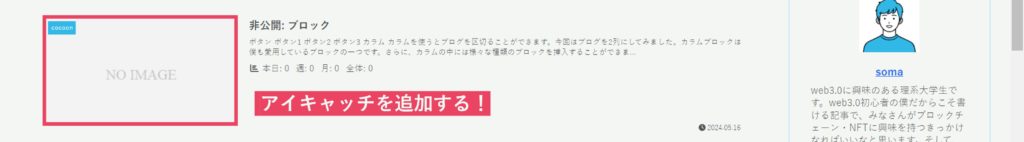 作成したブログの、投稿の一覧などを見られるページに行けばアイキャッチが追加できているか確認できる。