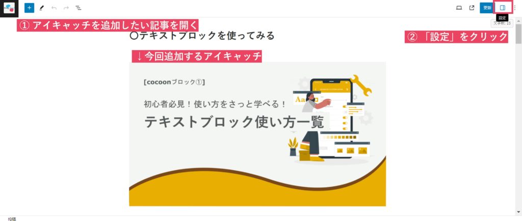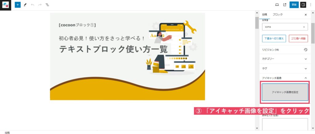 ③ 右に設定のタブが出てきますので、スクロールし、「アイキャッチ画像を設定」をクリックします。