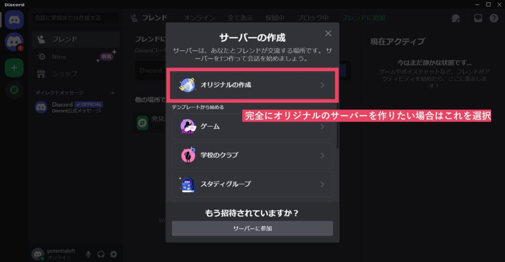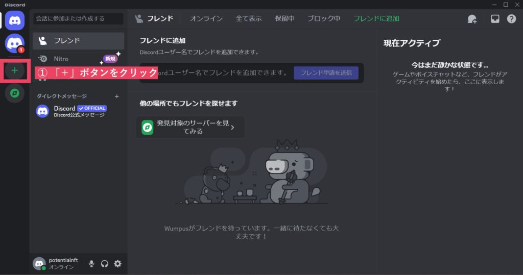 これまで、Discordのアカウントを作成し、追加してきました。それでは、いよいよサーバーを立てていきます。サーバーとはLINEグループのようなものです。同じ趣味の友達や、同じ目的を持った仲間が集まり、メッセージを送りあったり、通話したりします。でも、DiscordはLINEとは違い、グループに様々な機能をつけることができます!それも、おいおい説明しますね!