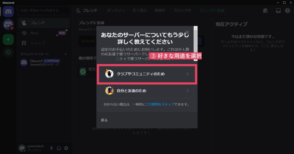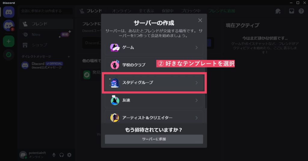 僕は、Web3.0を学び合う場を作りたいということで、スタディグループを選択しました。ここには、様々な用途がありますので、好きなものを選択してください。この、サーバーのテンプレートについては次の記事で紹介します。